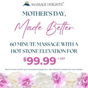 Celebrate Mom with the gift of relaxation – a 60-minute massage paired with a hot stone elevation for $99.99 + GST. For more details, please ask a lifestyle consultant at Massage Heights.*